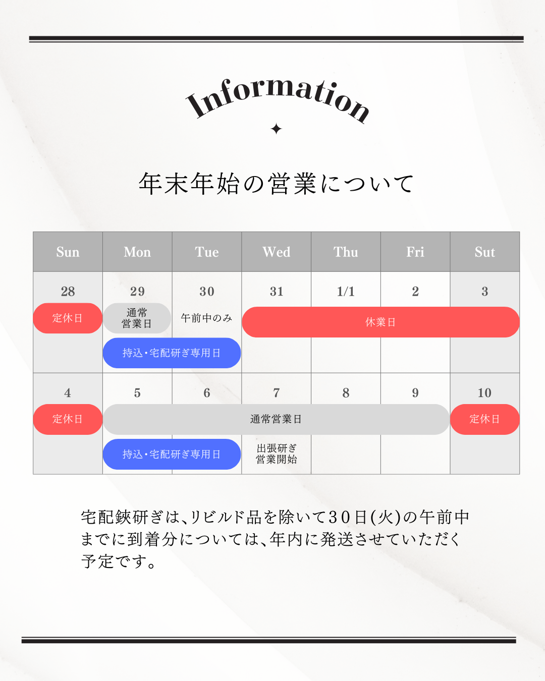12月27日 (金)通常営業12月28日・29日定休日12月30日 (月)午前中のみ営業(持込・宅配鋏研ぎ限定)12月31日~1月5日休み1月6日 (月)通常営業(持込・宅配鋏研…