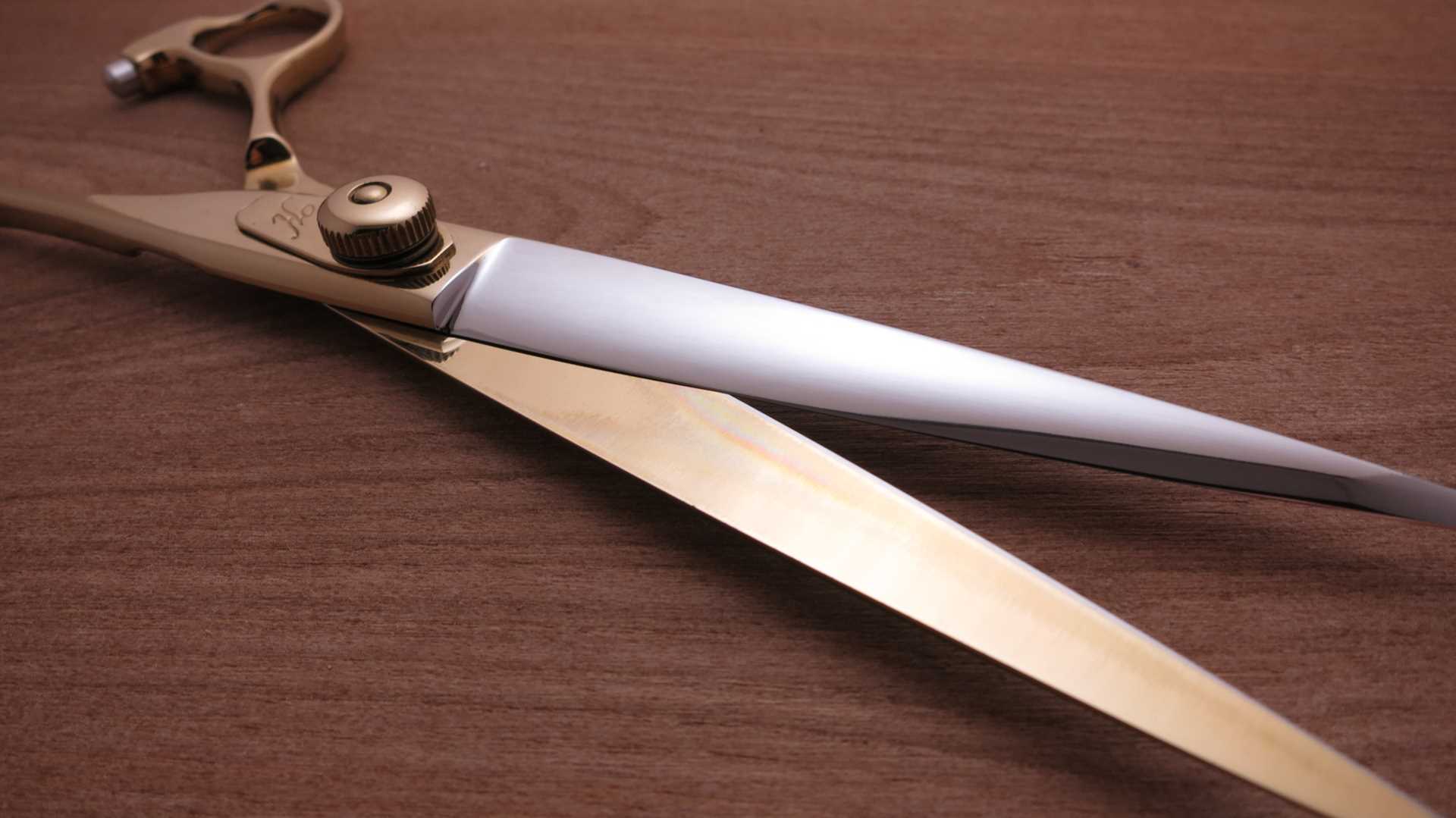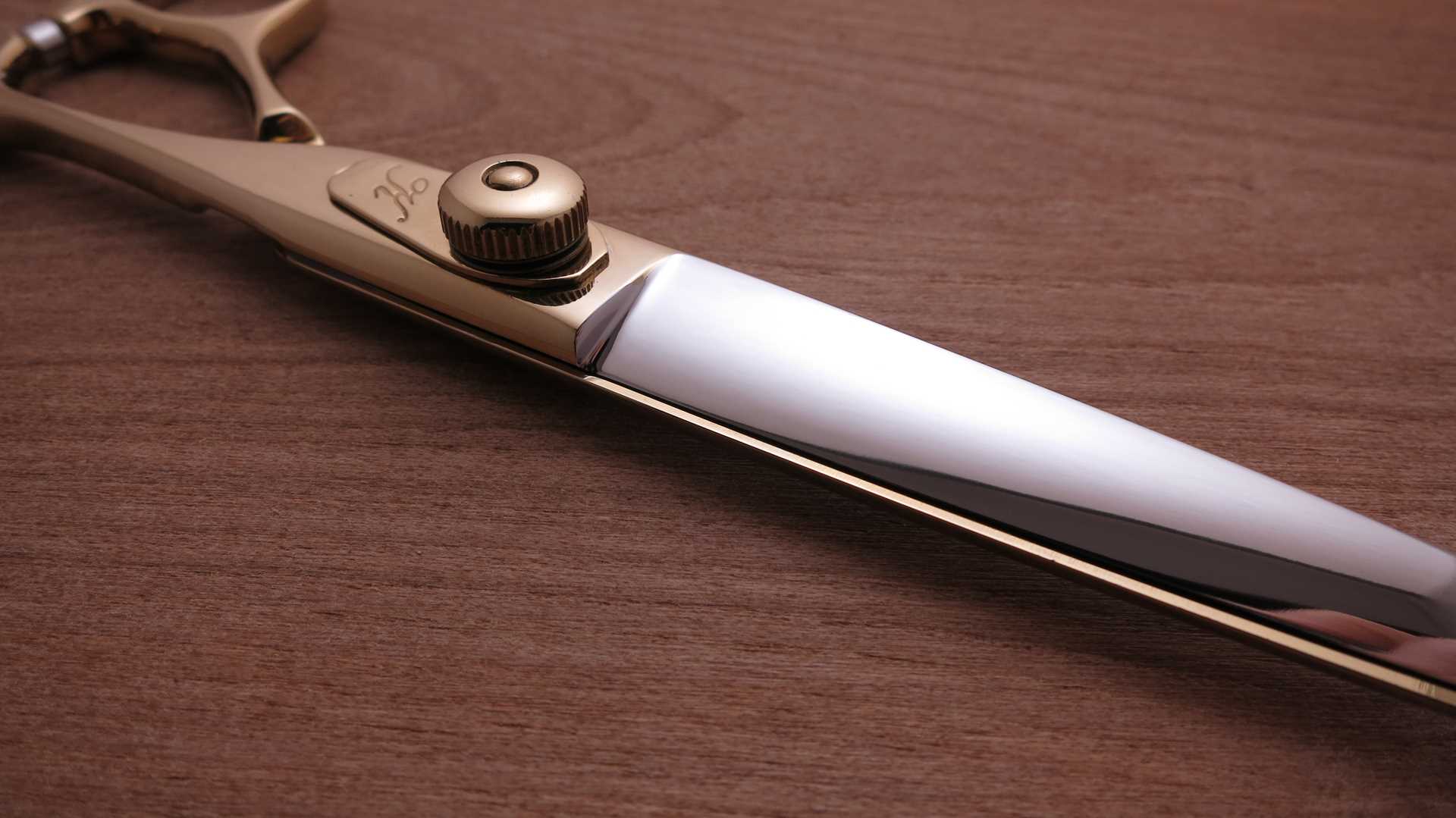 お持ち込みにて理容師様からリビルドを承りました。 チタンコーティングされている7インチの刈り上げ用シザーズです。